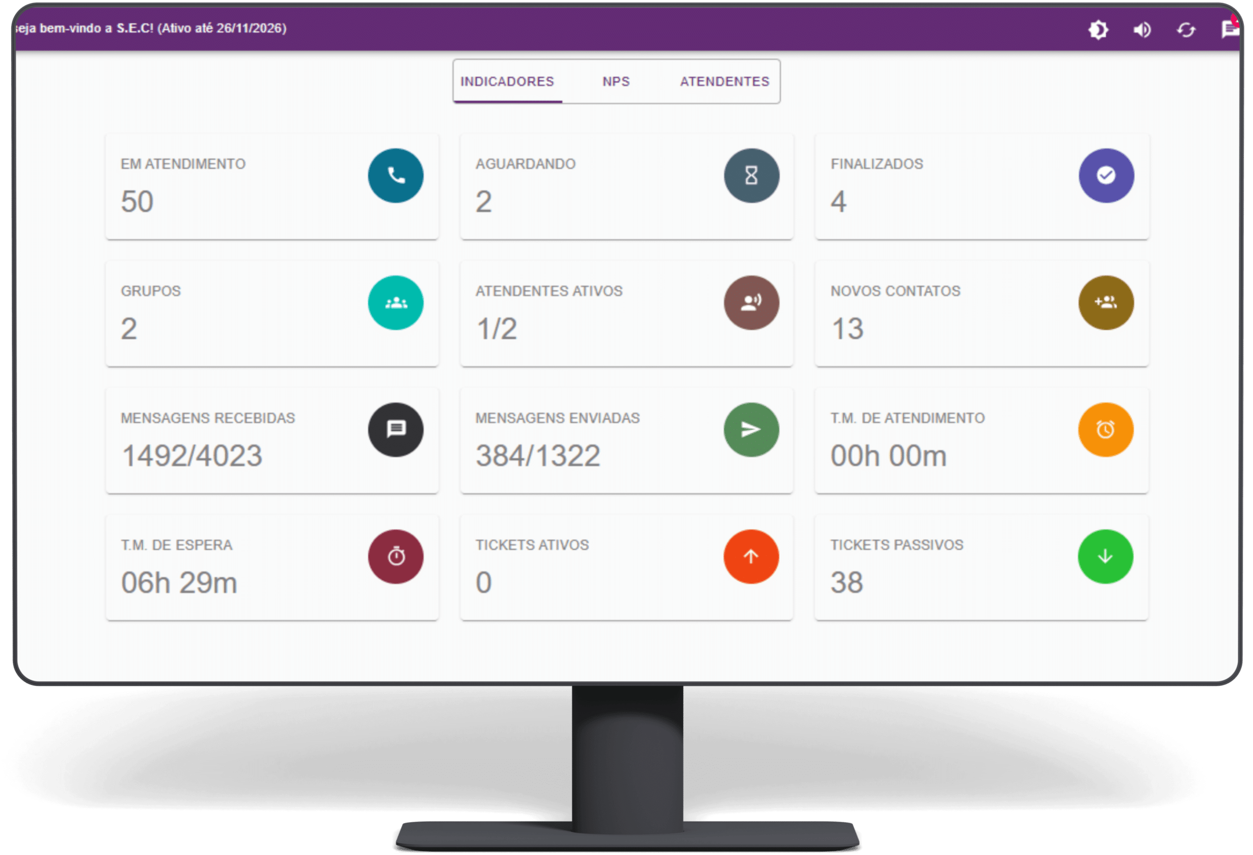 Acompanhe o desempenho da sua equipe de atendimento em tempo real com nosso Dashboard de Atendimento. Monitore métricas essenciais, como o NPS (Net Promoter Score), para garantir a satisfação dos clientes e identificar áreas de melhoria.