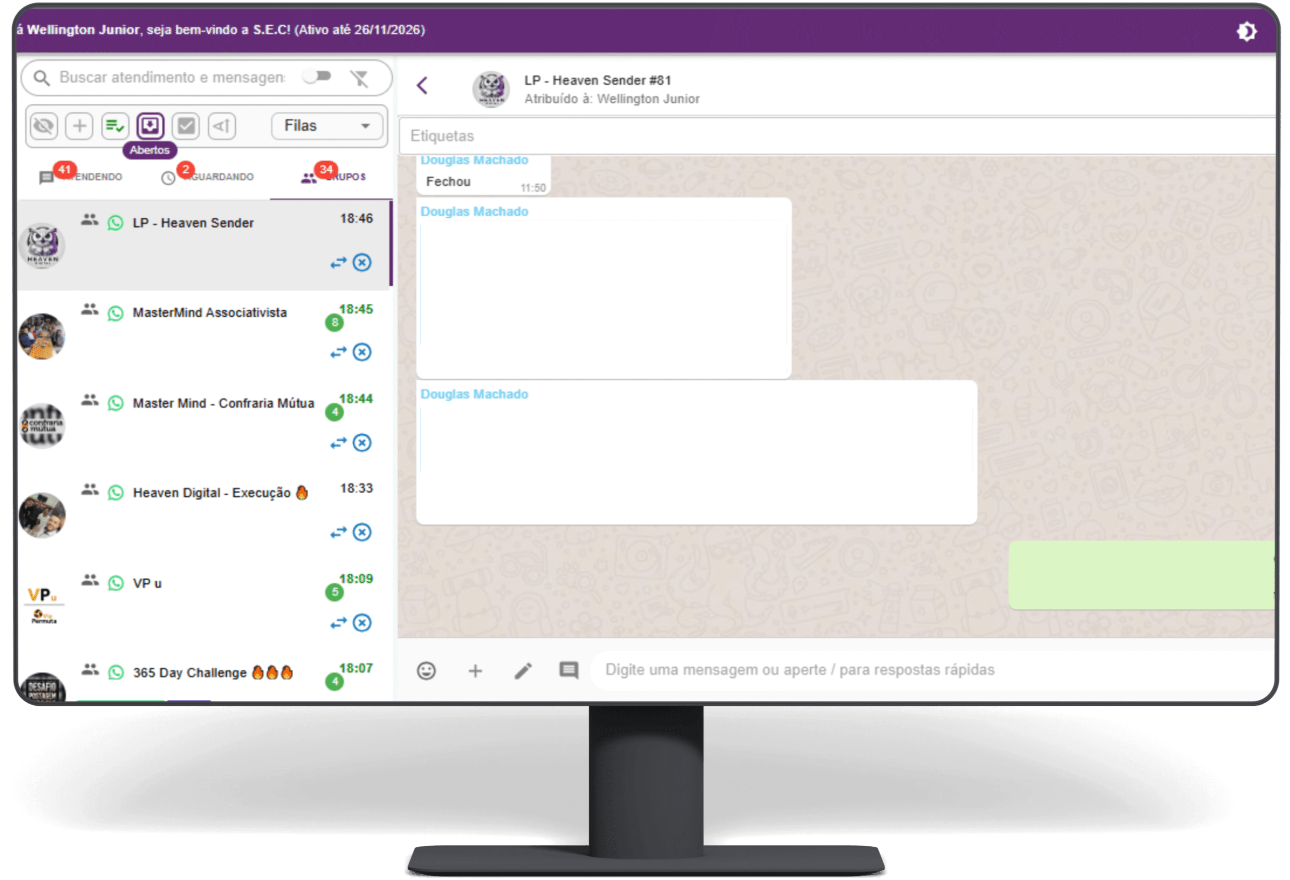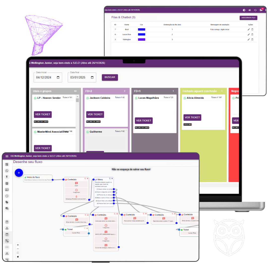 Gerencie diversos usuários dentro de um mesmo número de WhatsApp, com a possibilidade de assinatura de atendimento. Organize o fluxo de atendimento sistemático por meio de filas e mantenha o controle total sobre cada interação.